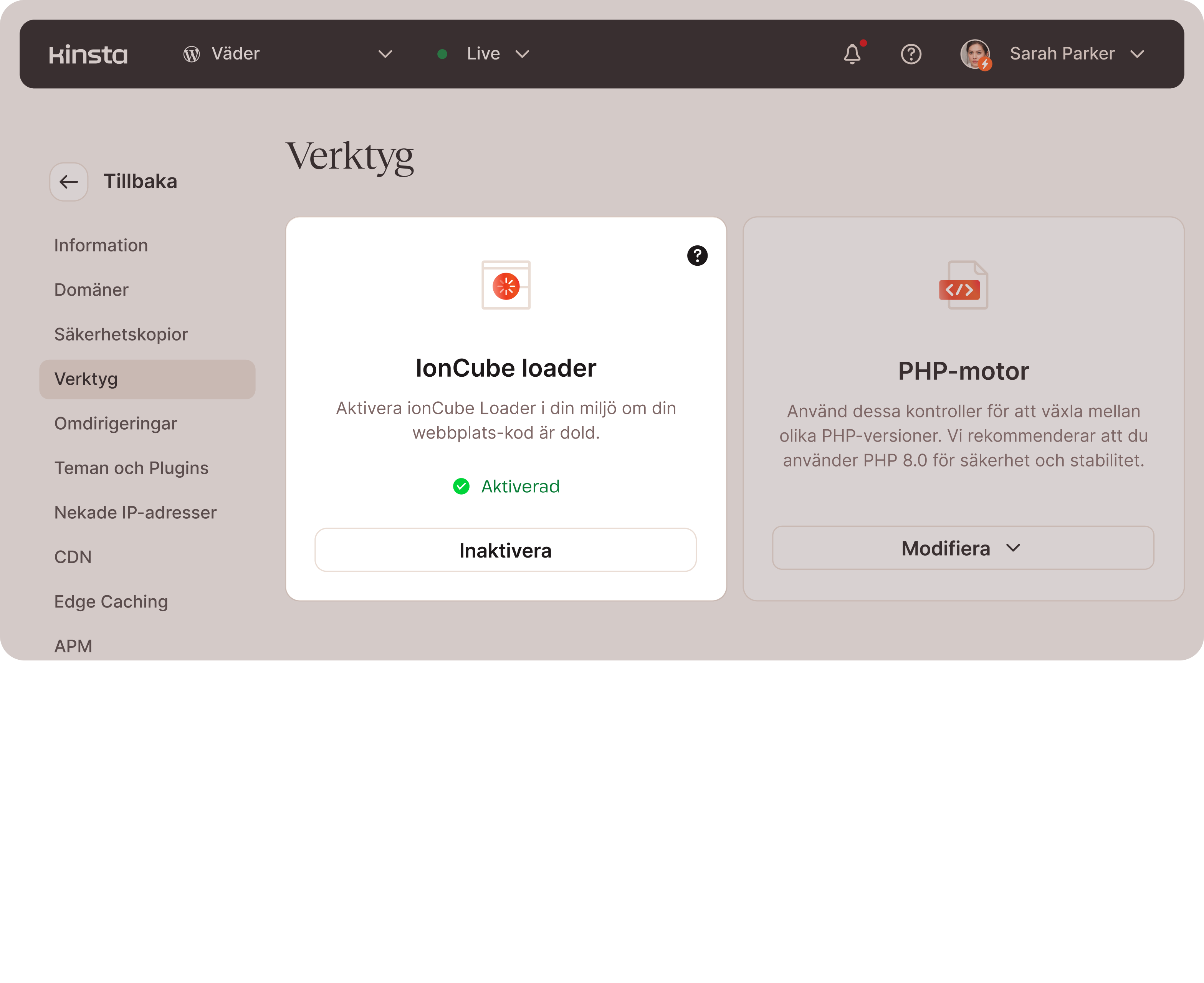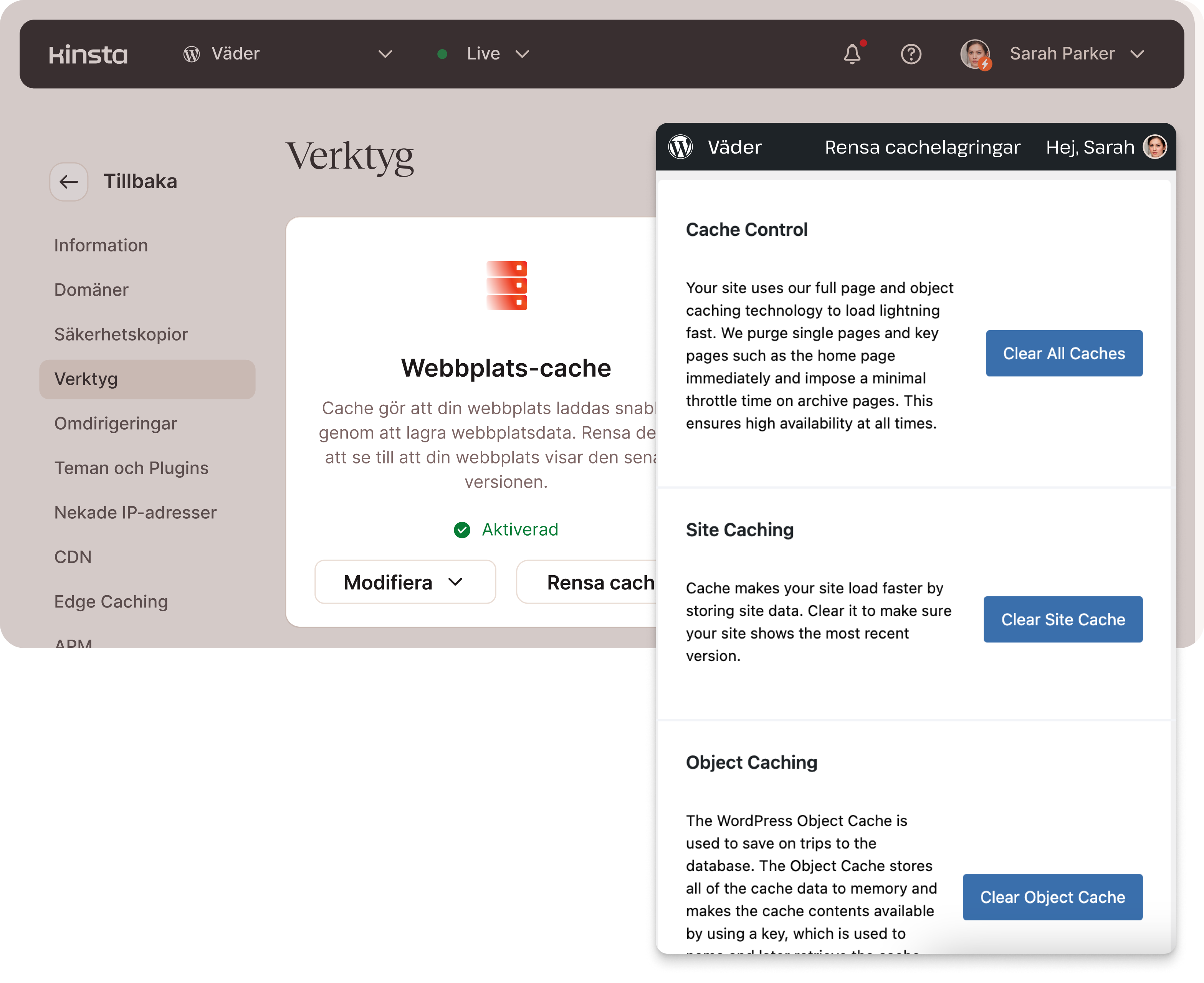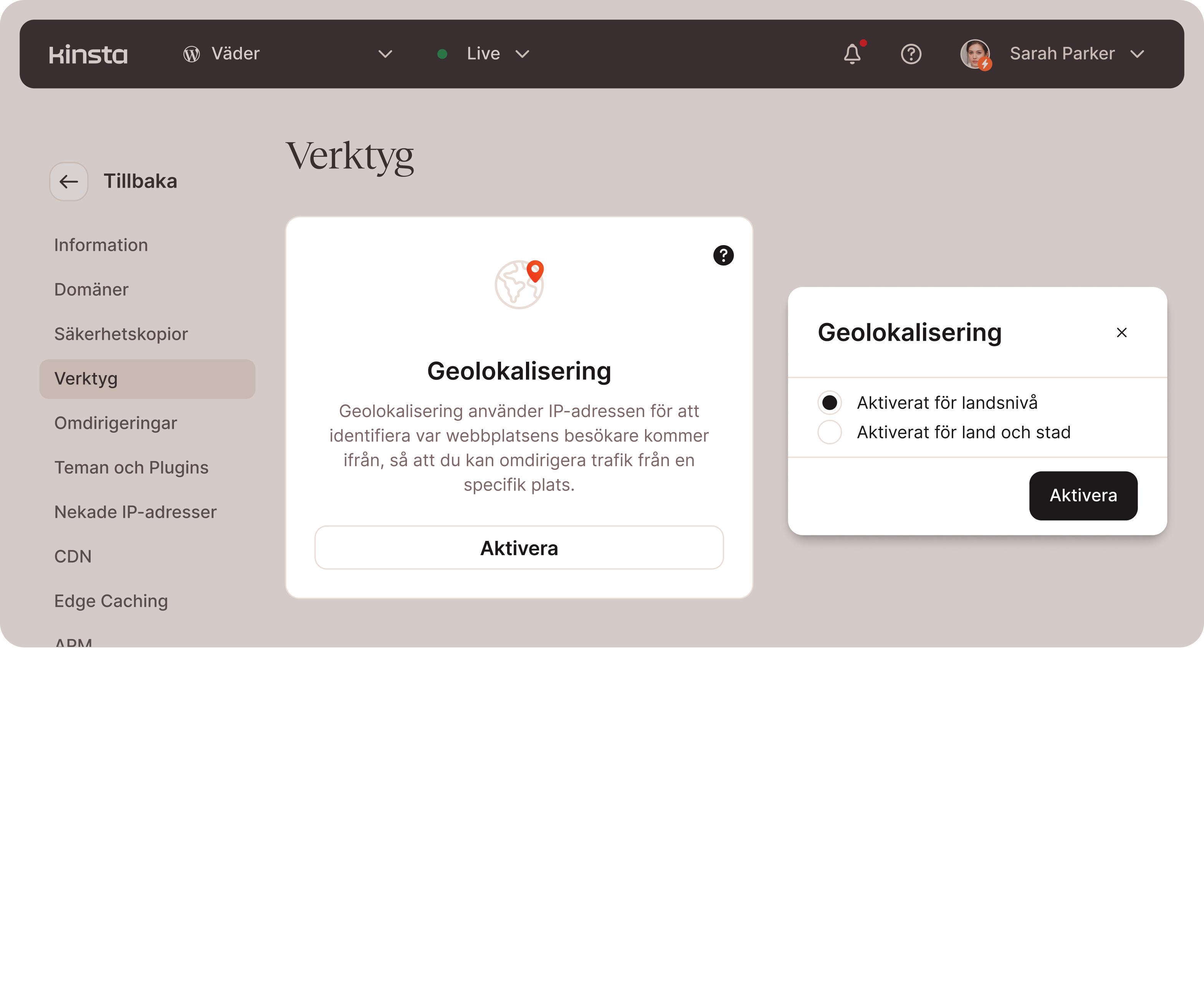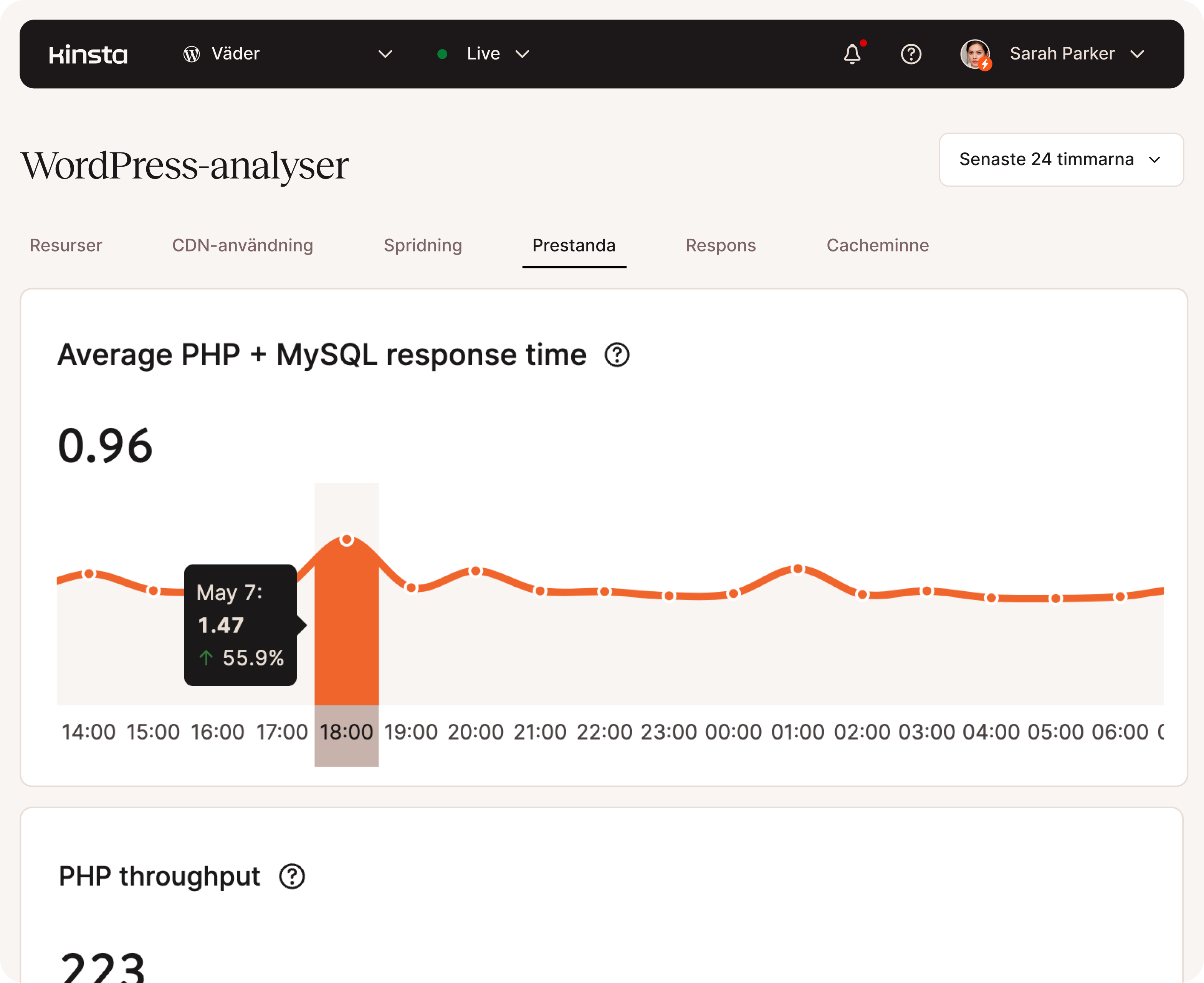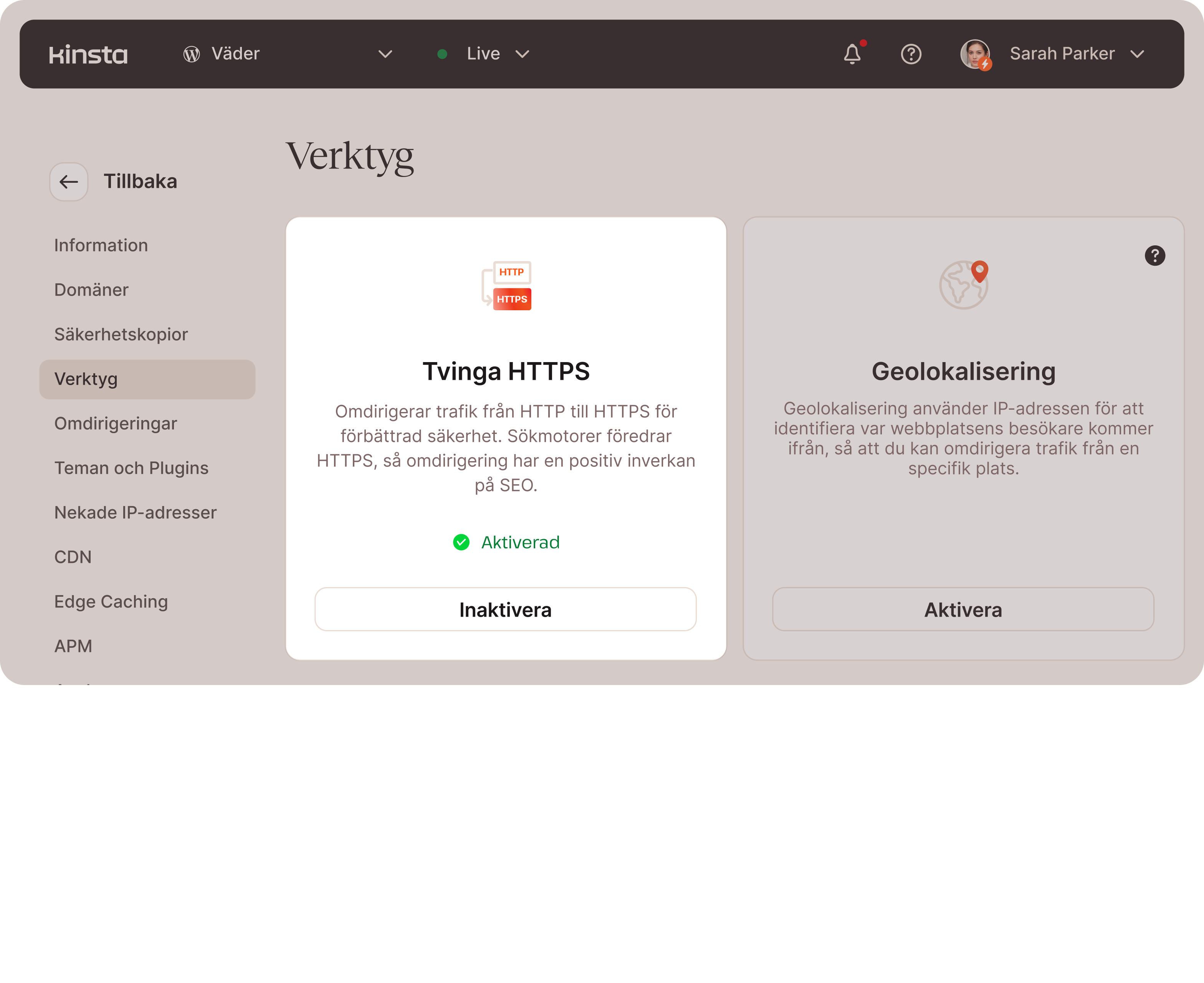 MyKinsta är kontrollcentret för ditt nätverk. Spåra exempelvis trafik, generera SSL-certifikat, konfigurera hastighets- och säkerhetsinställningar och mycket mer. Få alla verktyg du behöver på ett ställe. MyKinsta-instrumentpanelen finns på svenska.