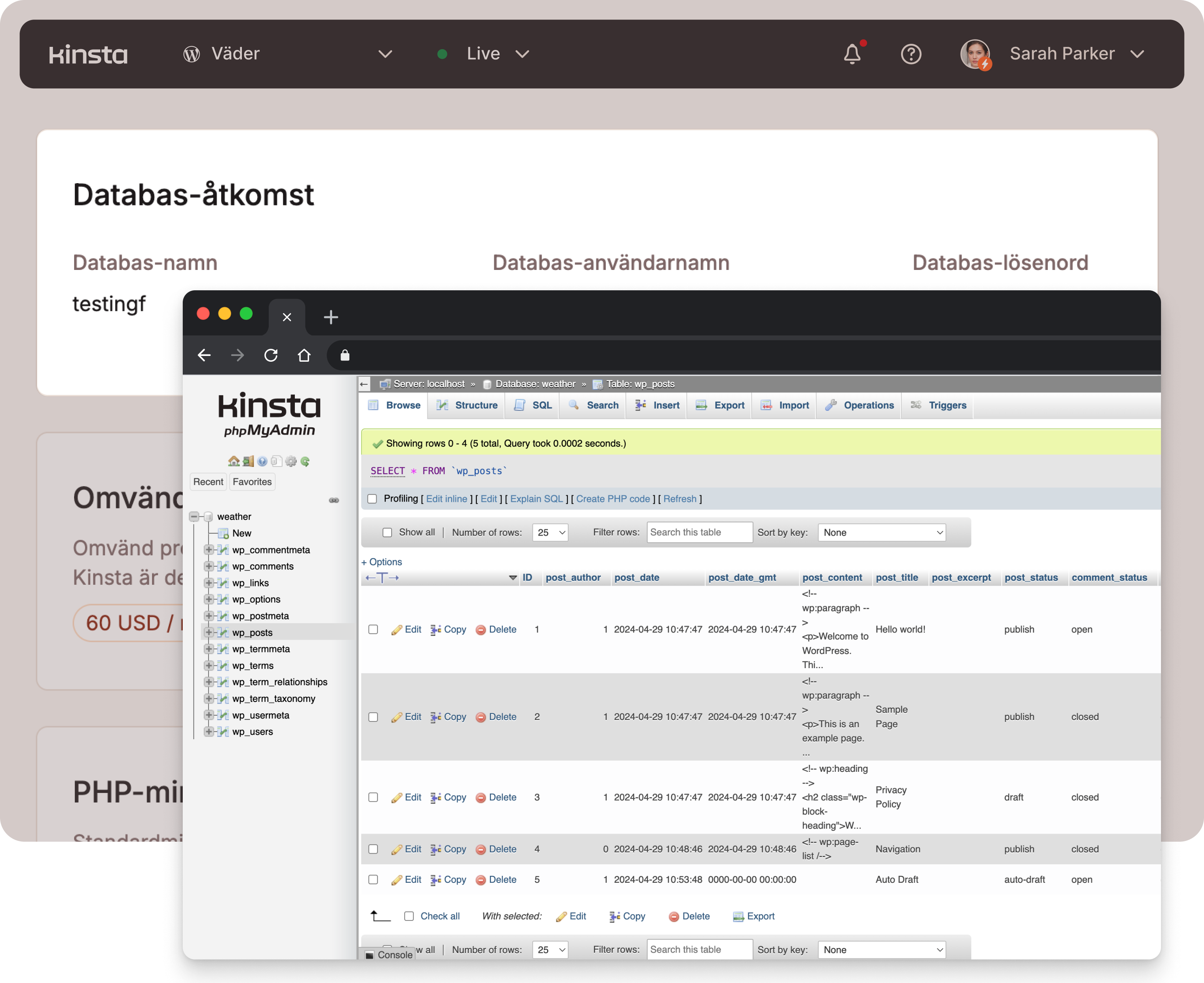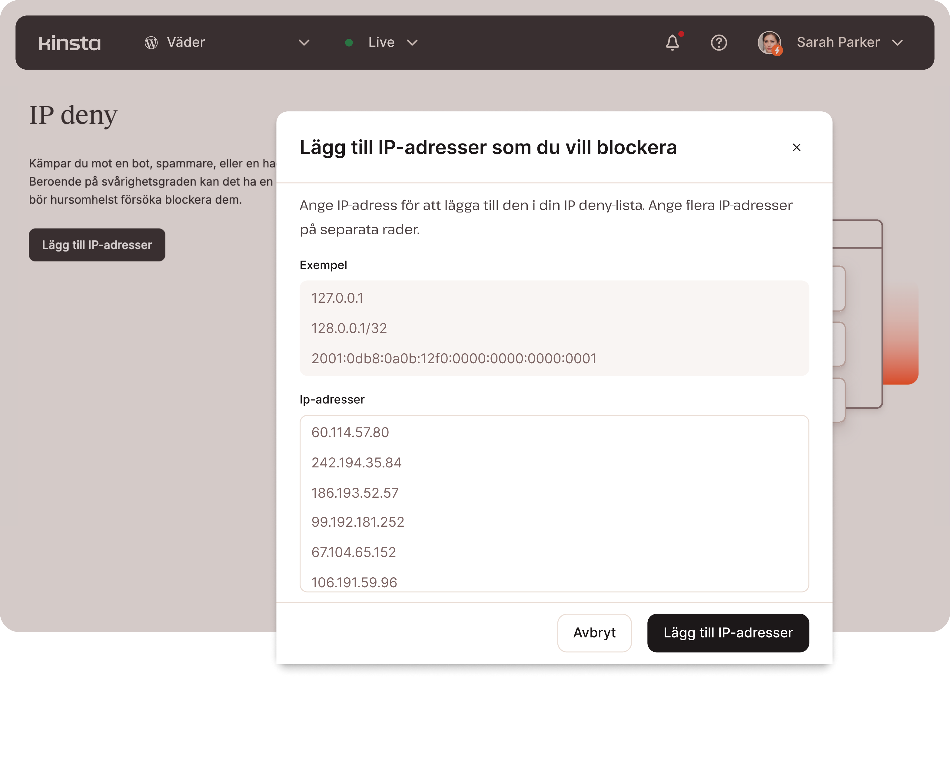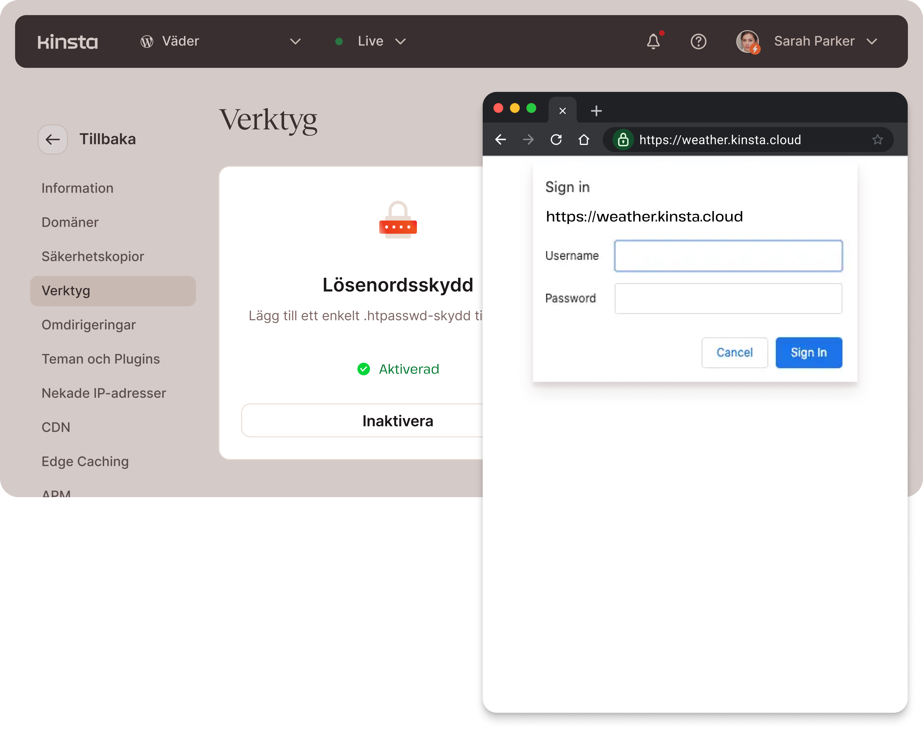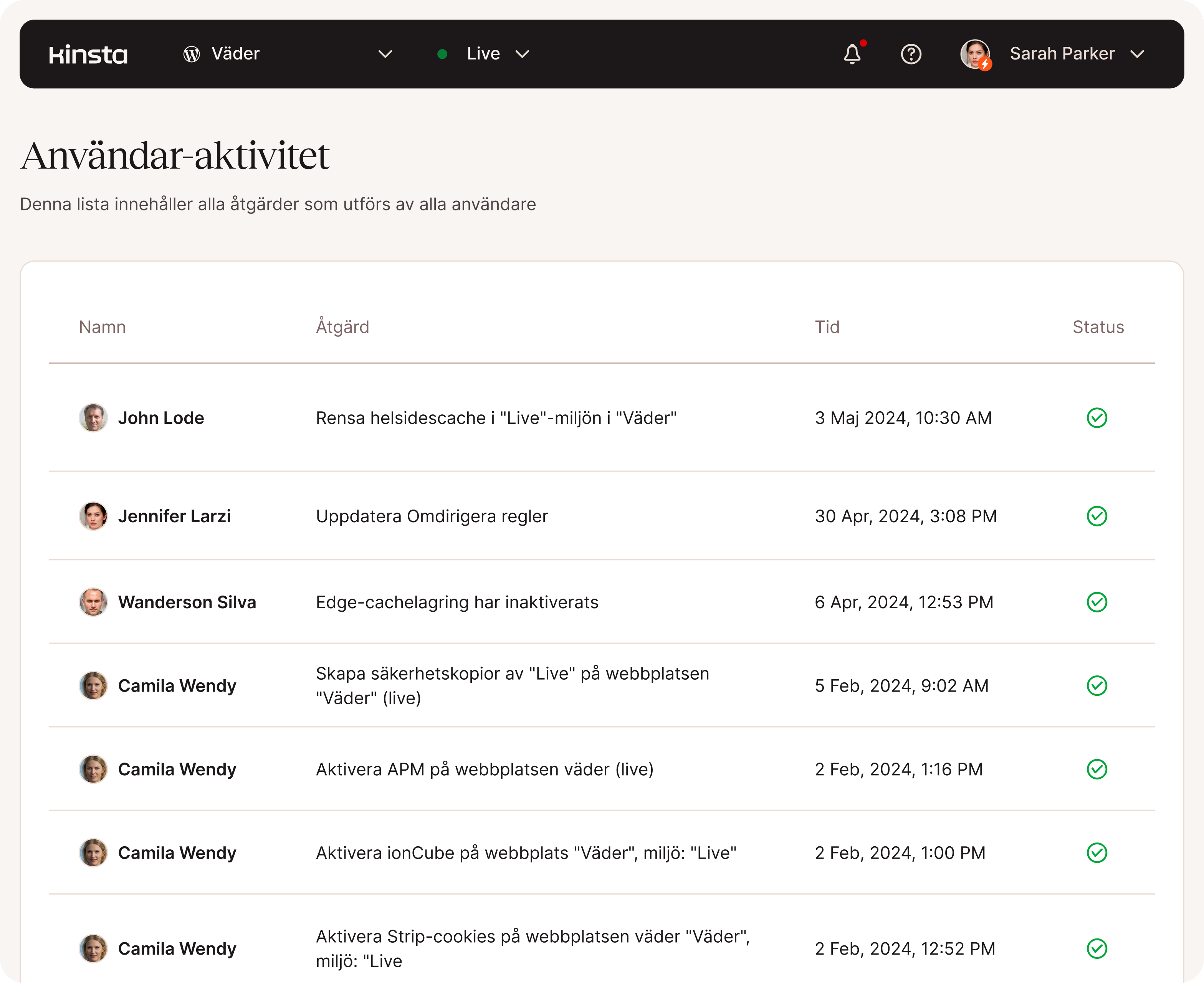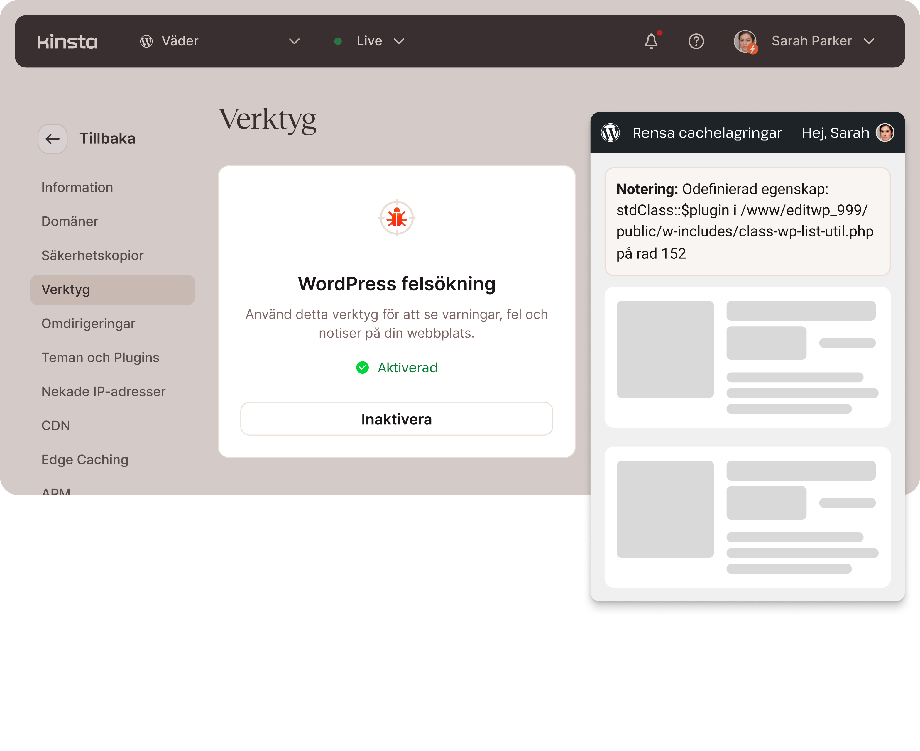 MyKinsta är kontrollcentret för ditt nätverk. Spåra exempelvis trafik, generera SSL-certifikat, konfigurera hastighets- och säkerhetsinställningar och mycket mer. Få alla verktyg du behöver på ett ställe. MyKinsta-instrumentpanelen finns på svenska.