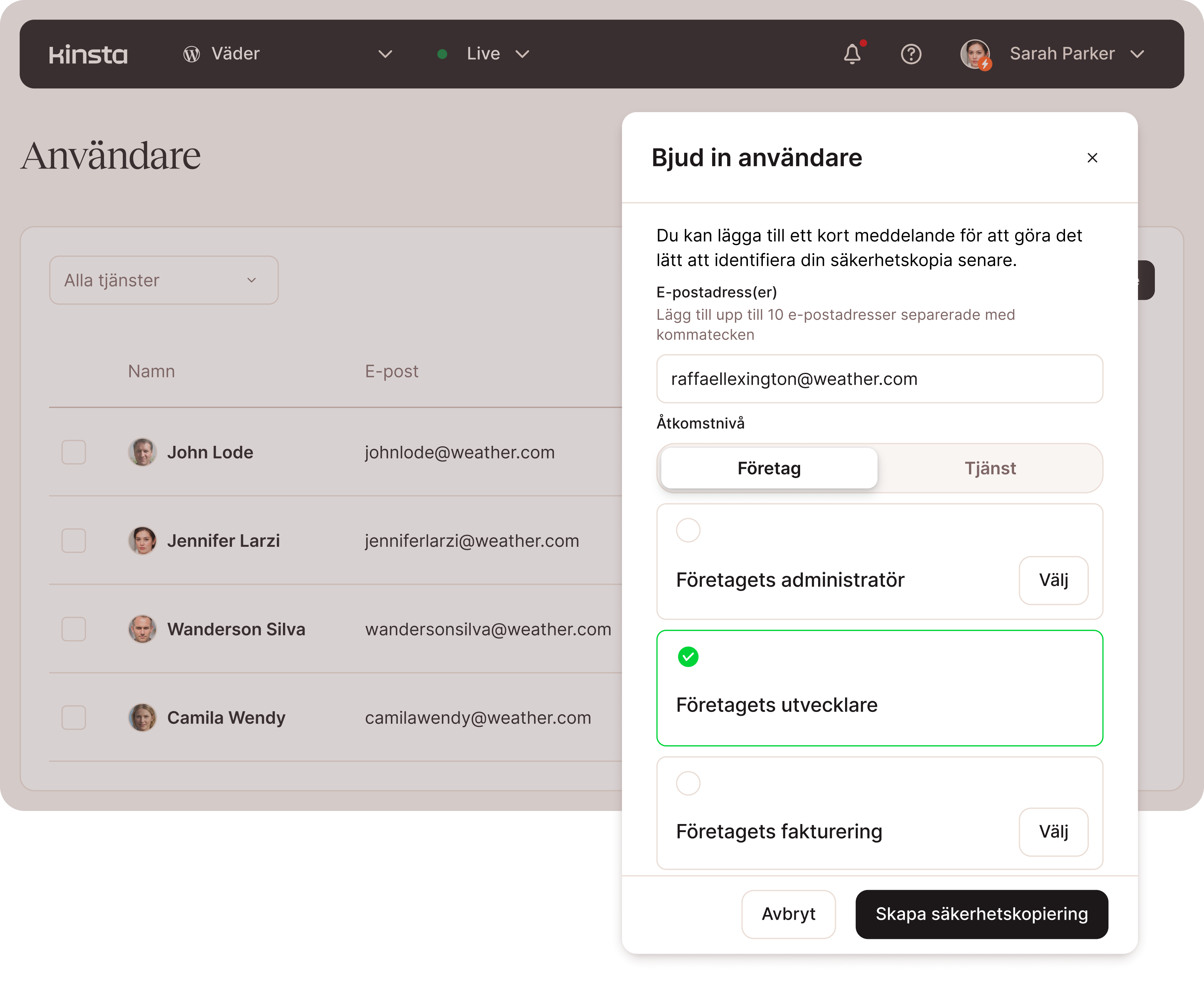 Lägg till obegränsat antal användare och konfigurera deras åtkomstnivåer med vår fleranvändarfunktion. Ge dessutom åtkomst på olika nivåer, oavsett om det gäller alla webbplatser i ditt nätverk eller ett specifikt område som ”fakturering”. Definiera MyKinsta-användarroller på företags- och webbplatsnivå.